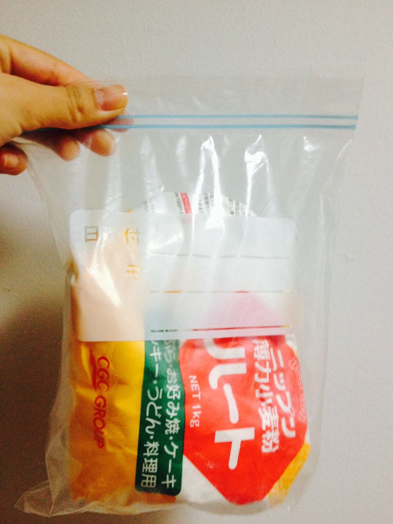 小麦粉は、下記のようにファスナー付の袋に入れた状態で、冷凍庫へ。粉は凍るわけでもなく、普通に使用できます。