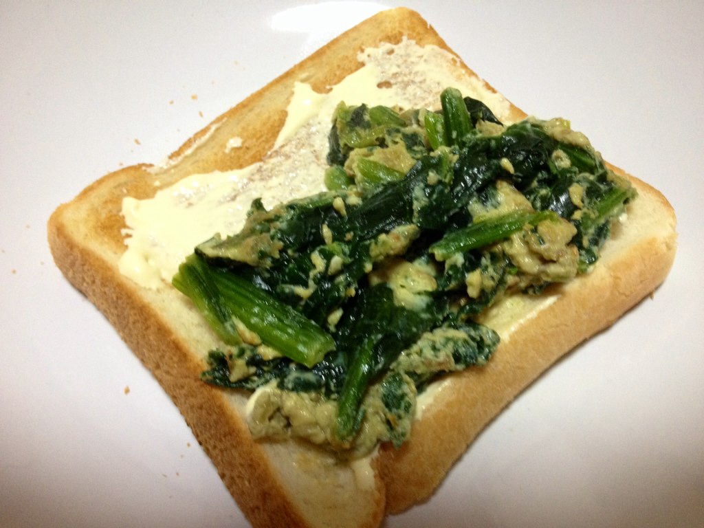 ③食パンの上に、ホウレンソウ卵とじをのせる。