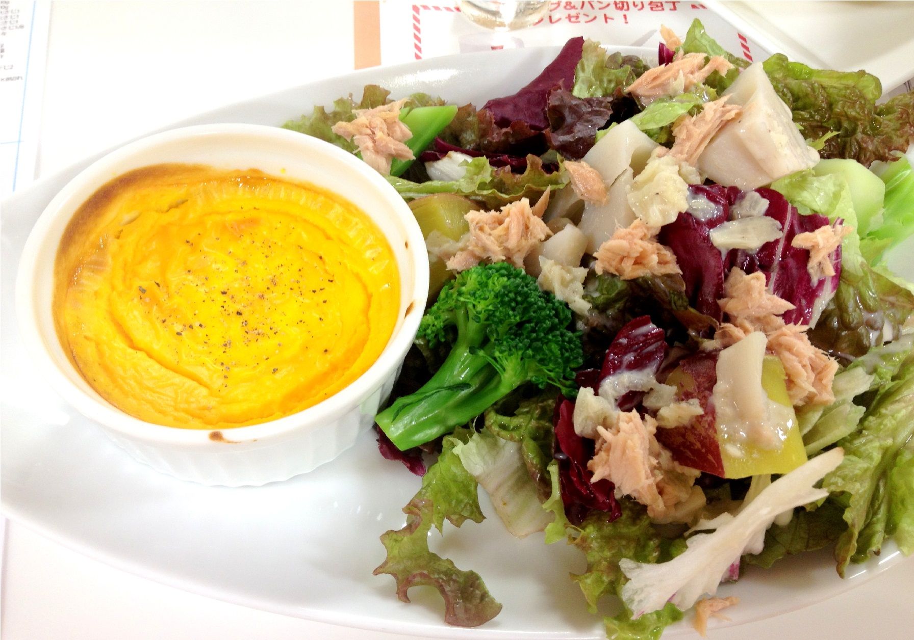 これもとってもおいしかった!ニンジンをバターでいためて、ミキサーにかけて、クリームチーズや卵や調味料と焼いて固めたもの。ミキサーにかけた段階で、牛乳を加えれば、ポタージュになる♪ニンジンの代わりに、かぼちゃで作ってみたい!